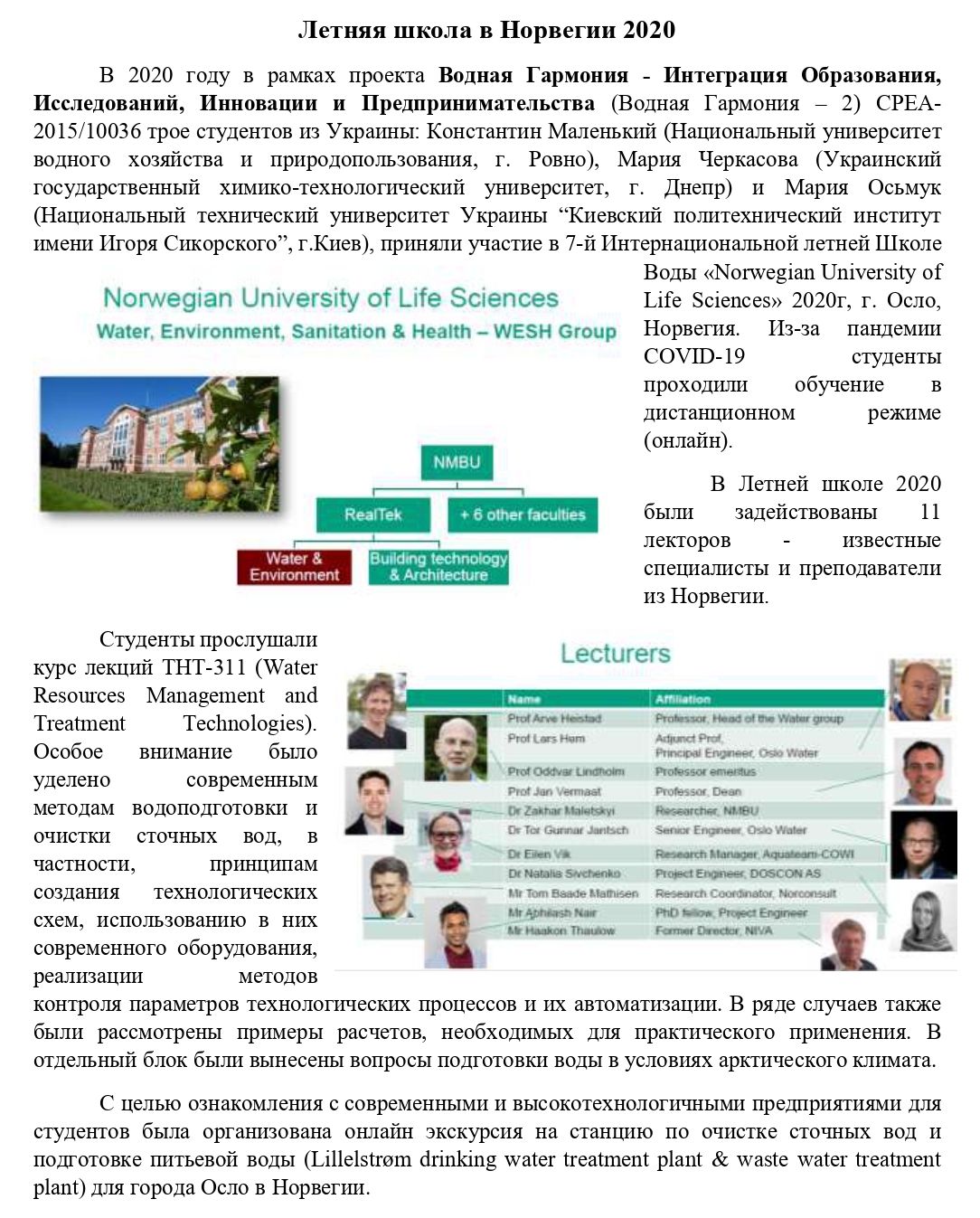 Традиционно, большой интерес вызвал отчет о летней школе студентов, где были представлены результаты опроса студентов после их обучения в летней школе в Норвегии. С 17 июня по 6 июля 2018 года прошла Летняя Школа «Water Harmony — 2018», участниками которой стали 68 человек (37 магистров, 10 PostDocs и 21 студент-бакалавр). Участники из 17 стран (Бангладеш, Беларусь, Камбоджа, Канада, Дания, Эфиопия, Казахстан, Кения, Кыргызстан, Молдова, Норвегия, Южный Судан, Шри-Ланка, Таджикистан, Уганда, Украина, США) представляли 5 проектов: